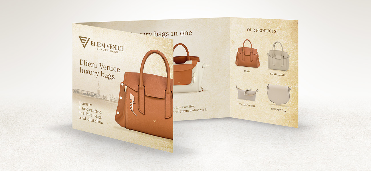 Depliant a tre ante sfalsate stampato su 300gr usomano. La grafica richiama i toni di Venezia dove il prodotto nasce e dal quale è ispirato.