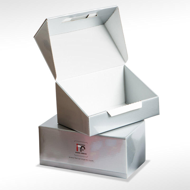Confezione per marmi, con sistema di chiusura autobloccante, costruita partendo da un campione fornito. Realizzata anche della grafica.