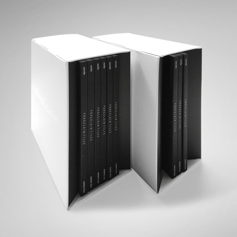 Complessa fustella automontante, costruita a partire da un campione fornito ma con misure diverse, per un cofanetto per la raccolta di opuscoli. Grafica realizzata dal cliente.
